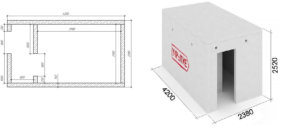 Наружный размер стен 4200х2400х2520 мм., проем 2000х800 мм., с перегородкой для защиты укрываемых.